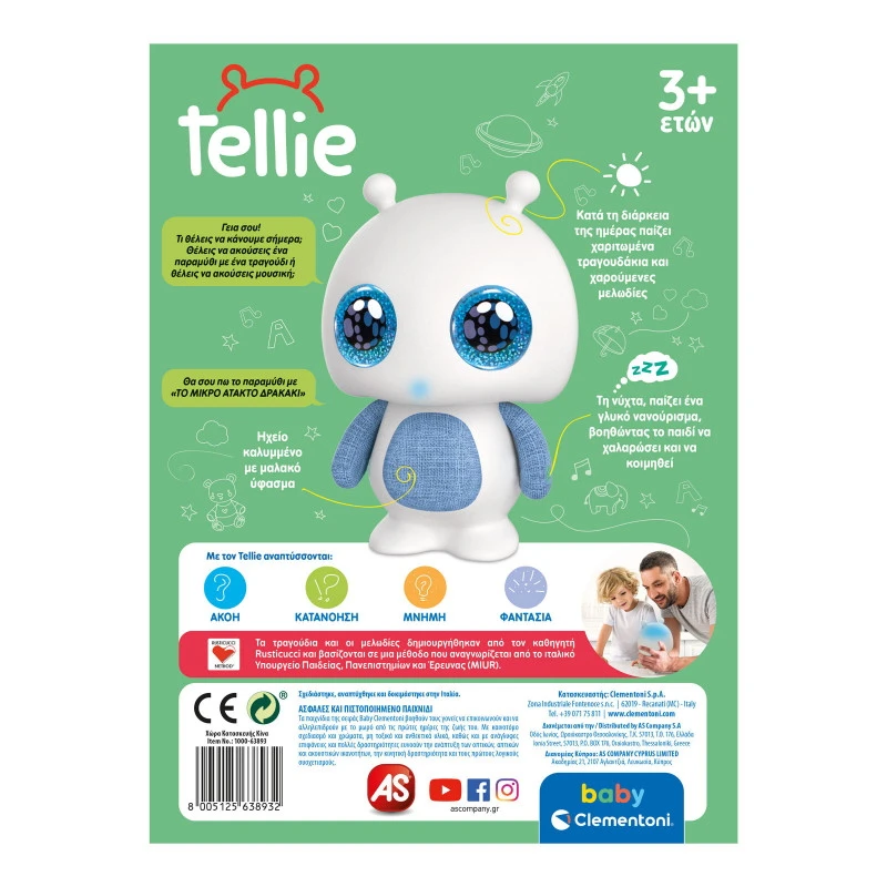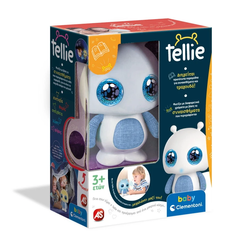 Ο Tellie, ο πρώτος διαδραστικός χαρακτήρας που διηγείται παραμύθια! Θέλεις να ακούσεις μια ιστορία ή να ακούσεις μουσική; Ο Tellie θα σου διηγηθεί 10 ιστορίες για συναισθήματα μαζί με τα τραγουδάκια τους, θα παίξει 5 μελωδίες, ενώ διαθέτει και την λειτουργία νανουρίσματος. Κάθε συναίσθημα συνδέεται με ένα μεμονωμένο χρώμα, που αναπαράγεται χάρη στα LED που έχει στο κεφάλι του. Ενθαρρύνει τη φαντασία, βοηθά στην ανάπτυξη της ικανότητας ακρόασης, ενώ ακόμα βοηθάει το παιδί να βυθιστεί σε ένα φανταστικό κόσμο μαθαίνοντας νέες λέξεις με απλό και διασκεδαστικό τρόπο!