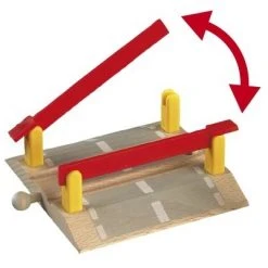 Οι πινακίδες προειδοποίησης δείχνουν σιδηροδρομική διέλευση. Χαμήλωσε τις μπάρες και άφησε το τρένο να περάσει. Στη συνέχεια, άνοιξε πάλι τον δρόμο για την κυκλοφορία των οχημάτων. Η διασταύρωση ταιριάζει με όλες τις σιδηροδρομικές γραμμές BRIO.