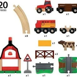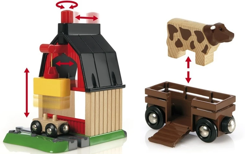 Στη φάρμα, η ζωή κυλάει ήρεμα. Η αγελάδα βρίσκεται στο βοσκοτόπι, ενώ το τρακτέρ μεταφέρει το φορτίο με το σανό στον αχυρώνα. Ο γερανός με τον μαγνήτη σηκώνει το σανό και το τοποθετεί στον αχυρώνα. Μπορείς να μεταφέρεις και την αγελάδα σου με το τρένο, με τη βοήθεια της αναδιπλούμενης ράμπας.