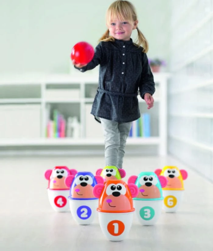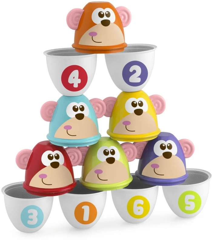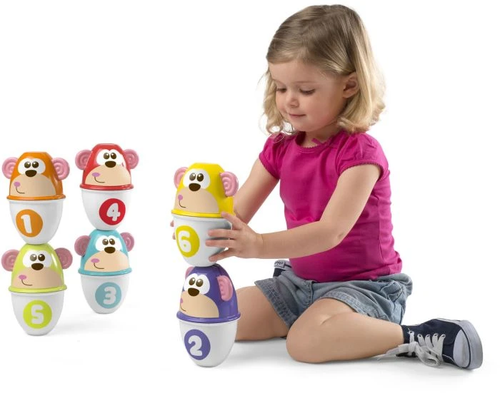 Το πρώτο του μπόουλινγκ σετ με 6 χρωματιστά κορίνες – μαϊμουδάκια. Οι κορίνες μπορούν να χωριστούν τη μέση και να βάζετε το ένα κομμάτι πάνω στο άλλο χτίζοντας υπέροχους πύργους. Κάθε κορίνα έχει διαφορετικό χρώμα και αριθμό. Βοηθά στην ανάπτυξη της δημιουργικότητας και του κινητικού συντονισμού.