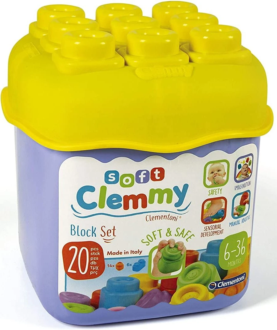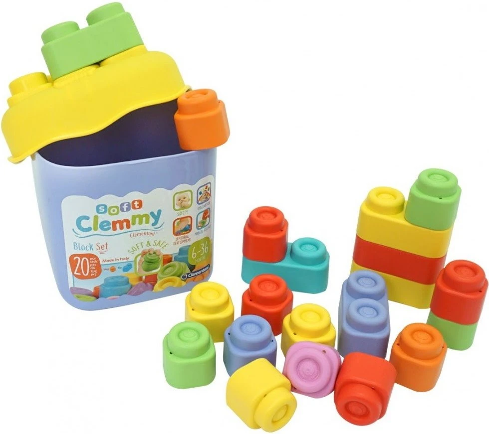 Clemmy μαλακά τουβλάκια μέσα σε κουβαδάκι! Περιέχει 20 τεμάχια, μη τοξικά, ανθεκτικά, πλένονται και καθαρίζονται εύκολα με το νερό. Ιδανικά για τις πρώτες κατασκευές και ατέλειωτες ώρες παιχνιδιού με απόλυτη ασφάλεια.