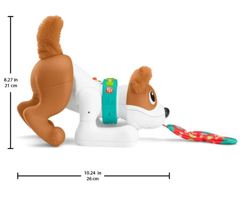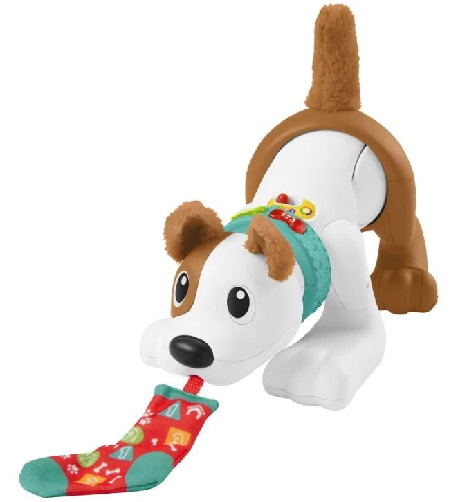 Ένα ηλεκτρονικό σκυλάκι με ρεαλιστικές κινήσεις που ενθαρρύνει το μωρό να μπουσουλήσει και το απασχολεί με πολύχρωμα φωτάκια, μουσική και τρία εκπαιδευτικά στάδια ανάλογα με τις ανάγκες της ηλικίας του. Τραβήξτε την κάλτσα για να κουνήσει το σκυλάκι την ουρά του, το κεφάλι του και να προχωρήσει “προσκαλώντας” το μωρό να το ακολουθήσει. Κολάρο με φωτάκια που μπορεί να πατήσει το μωρό για να αναβοσβήσουν. Μαλακά αυτάκια και ουρά, ιδανικά για χάδια! Επίπεδο 1 – Εξερεύνηση (6 Μηνών+): Καθώς το μωρό παίζει, ακούει διασκεδαστικούς ήχους και φράσεις που του μαθαίνουν χρώματα και αριθμούς. Επίπεδο 2 – Ενθάρρυνση (12 Μηνών+): Το μωρό ακούει εντολές και εντοπίζει σχήματα και χρώματα μετρώντας από το ένα μέχρι το 10 και ακούει το αλφάβητο ενώ παράλληλα προσπαθεί να πιάσει την κάλτσα! Επίπεδο 3 – Μίμηση (18 Μηνών+): Αστείοι ήχοι και φράσεις ενθαρρύνουν το μωρό να κινηθεί ακριβώς σαν το αγαπημένο του κουτάβι!