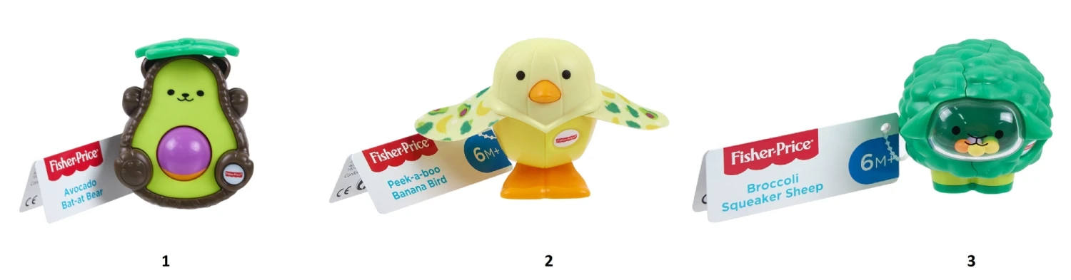 Βρεφικά παιχνίδια δραστηριοτήτων Fisher-Price® με θέμα τρόφιμα και ζωάκια. Τρία βρεφικά παιχνίδια, το Αρκουδάκι-Αβοκάντο, το Πουλάκι-Μπανάνα και το Προβατάκι-Μπρόκολο, που αναπτύσσουν την κινητική ανάπτυξη του μωρού με δραστηριότητες και ήχους.