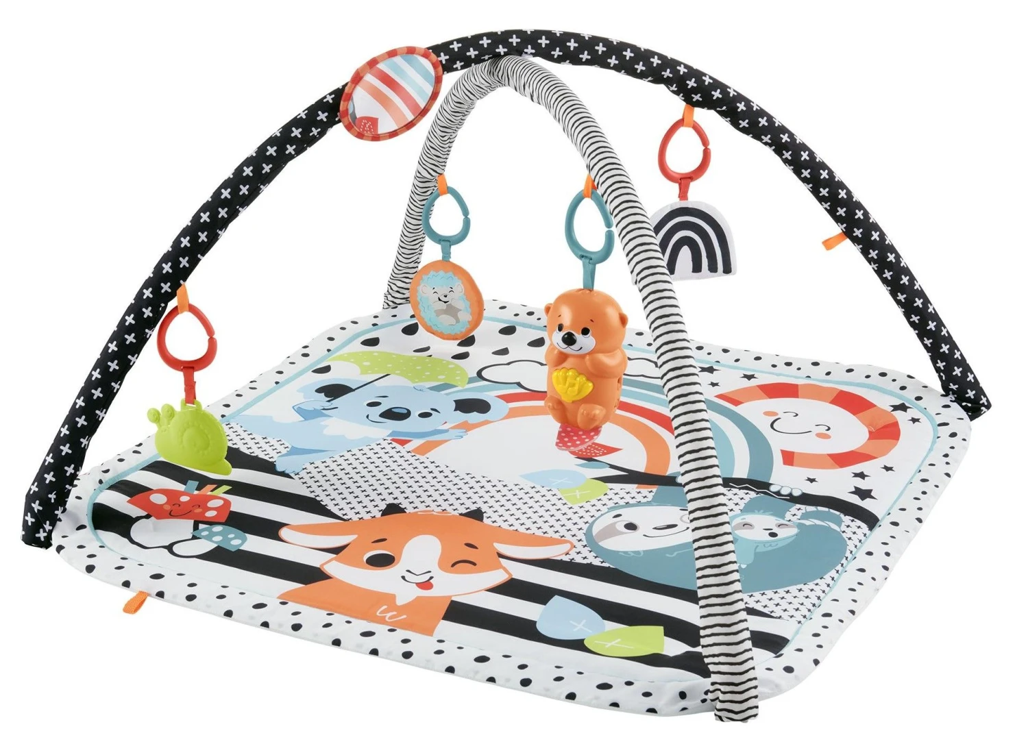 Το μωρό σας θα διασκεδάσει πολλές ώρες στο Μουσικό Γυμναστήριο 3 σε 1 της Fisher-Price®. Το αποσπώμενο παιχνίδι βίδρας διαθέτει δύο μουσικές ρυθμίσεις, μεγάλης και μικρής διάρκειας, με έως και 15 λεπτά μουσικής και απαλό φως. Τέσσερα επιπλέον παιχνίδια δραστηριοτήτων κρατούν τα χεράκια τους απασχολημένα καθώς χαλαρώνουν και παίζουν στο άνετο πάπλωμα που πλένεται στο πλυντήριο. Επιπλέον, τα χρώματα έντονων αντιθέσεων μπορούν να βοηθήσουν στην ανάπτυξη της όρασης του μωρού. ? Ποιον βλέπεις; Καθρεφτάκι για να βλέπει τον ευατό του Το μωρό διασκεδάζει με ήχους καθώς παίζει με το σκαντζοχοιράκι Σκαντζοχοιράκι οδοντοφυΐας χωρίς BPA για να βάζει στο στόμα του Παιχνίδια δραστηριοτήτων με κρίκους για μεταφορά Στη Fisher-Price μπορεί να γιορτάζουμε σχεδόν 90 χρόνια, αλλά παραμένουμε παιδιά. Γιατί ο μόνος τρόπος να κάνεις καταπληκτικά πράγματα για τα μωρά και τα παιδιά είναι να νιώθεις σαν και αυτά. Αυτός είναι ο λόγος για τον οποίο έχουμε κάνει αποστολή μας να προσθέσουμε την ψυχαγωγία σε λειτουργικά προϊόντα βρεφανάπτυξης και το παιχνίδι στην… ώρα παιχνιδιού. Γυρίζουμε πίσω στην παιδική ηλικία. Θέλετε να μας ακολουθήσετε; • Αίσθηση της Όρασης: Μια ποικιλία υλικών, χρωμάτων και ήχων αναπτύσσουν την αίσθηση της αφής, της όρασης και της ακοής του μωρού. • Κινητικές Ικανότητες: Καθώς το μωρό σηκώνει το κεφάλι του και σπρώχνει με τα χέρια για να παίξει, δυναμώνει ο αυχένας και οι μύες του κορμού του. • Λεπτή Κινητικότητα: Πιάνοντας τα παιχνίδια και βάζοντάς τα στο στόμα του, το μωρό αναπτύσσει το συντονισμό όρασης-κίνησης χεριών.