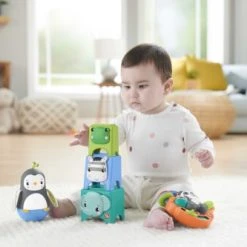 •Σετ με 3 πολύχρωμα ζωάκια-κύβους για να στοιβάζει και να ταξινομεί το μωρό, που αναπτύσσει τη λεπτή κινητικότητα και τον συντονισμό όρασης-κίνησης χεριών και άλλα