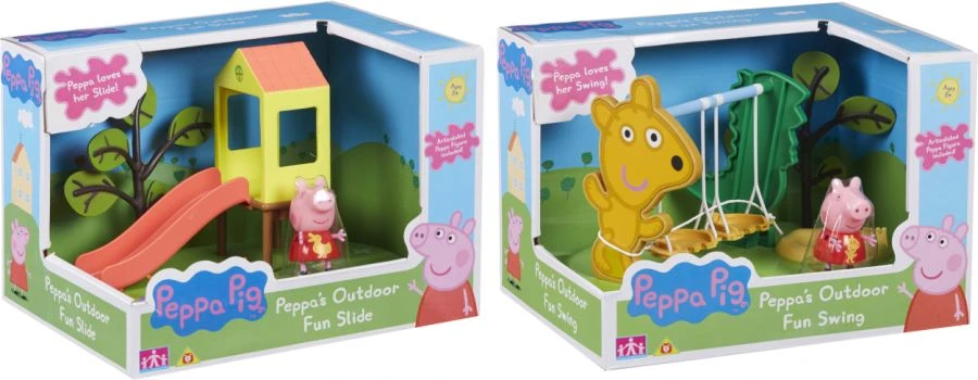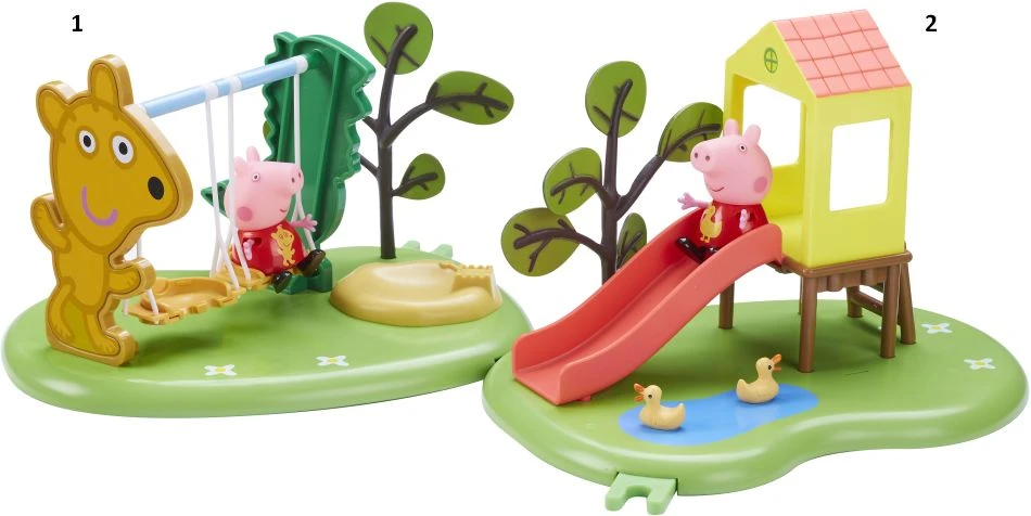 Σετ παιχνιδιού με θέμα παιχνίδια από την παιδική χαρά. Διατίθενται 2 ανανεωμένα σχέδια. Κάθε σετ πωλείται ξεχωριστά μαζί με φιγούρα. Ένωσε τα 2 σετ παιχνιδιού και φτιάξε την πιο γουρουνίσια παιδική χαρά!