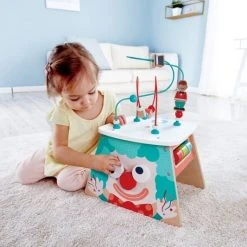 Hape Κύβος Δραστηριοτήτων Με Εναλασσόμενα Φωτάκια Ένας διασκεδαστικός κύβος δραστηριοτήτων με θέμα το τσίρκο. Γυρίστε τους περιστρεφόμενους δίσκους για να δείτε τις εναλλαγές φωτός και προβολής χρωμάτων. Προσπαθείστε να περάσετε τις χάντρες μέσα από τον λαβύρινθο με τον ιπτάμενο καλλιτέχνη!