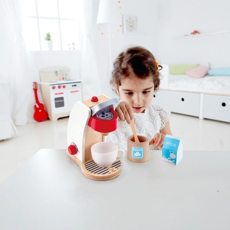 Hape Playfully Delicious Ξύλινη Καφετιέρα και Αξεσουάρ Περιλαμβάνει φλιτζάνι, κουτάλι, ζάχαρη και γάλα.Δηλαδή ότι χρειάζεσαι για να φτιάξεις τον πιο ωραίο καφέ. Διαστάσεις προϊόντος: 17,5×10,6×19,6cm (ΜxΠxΥ).