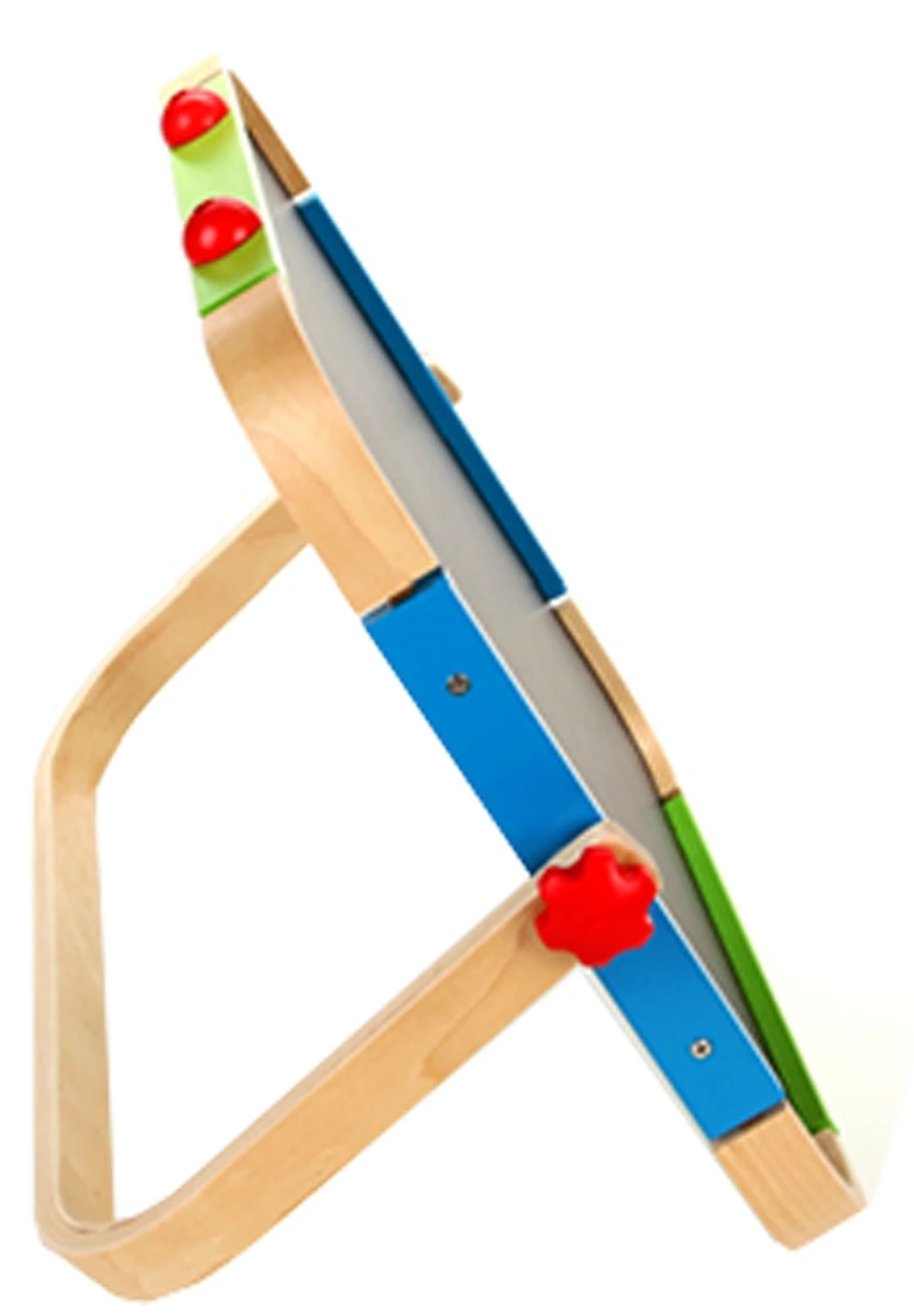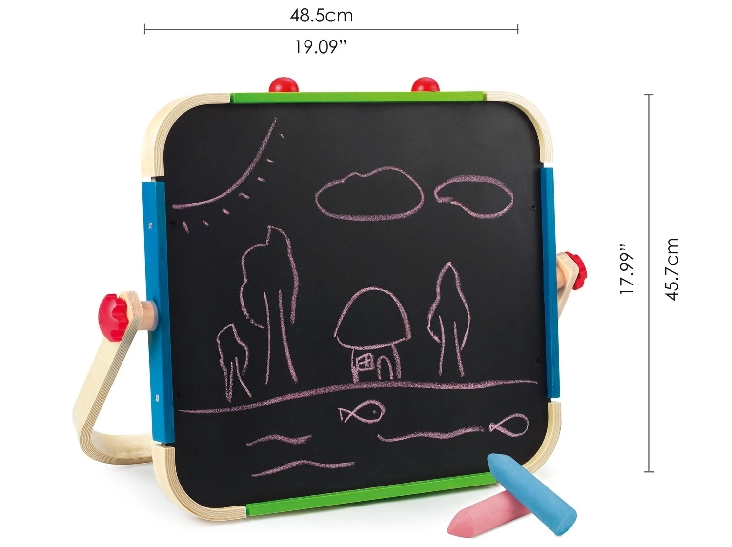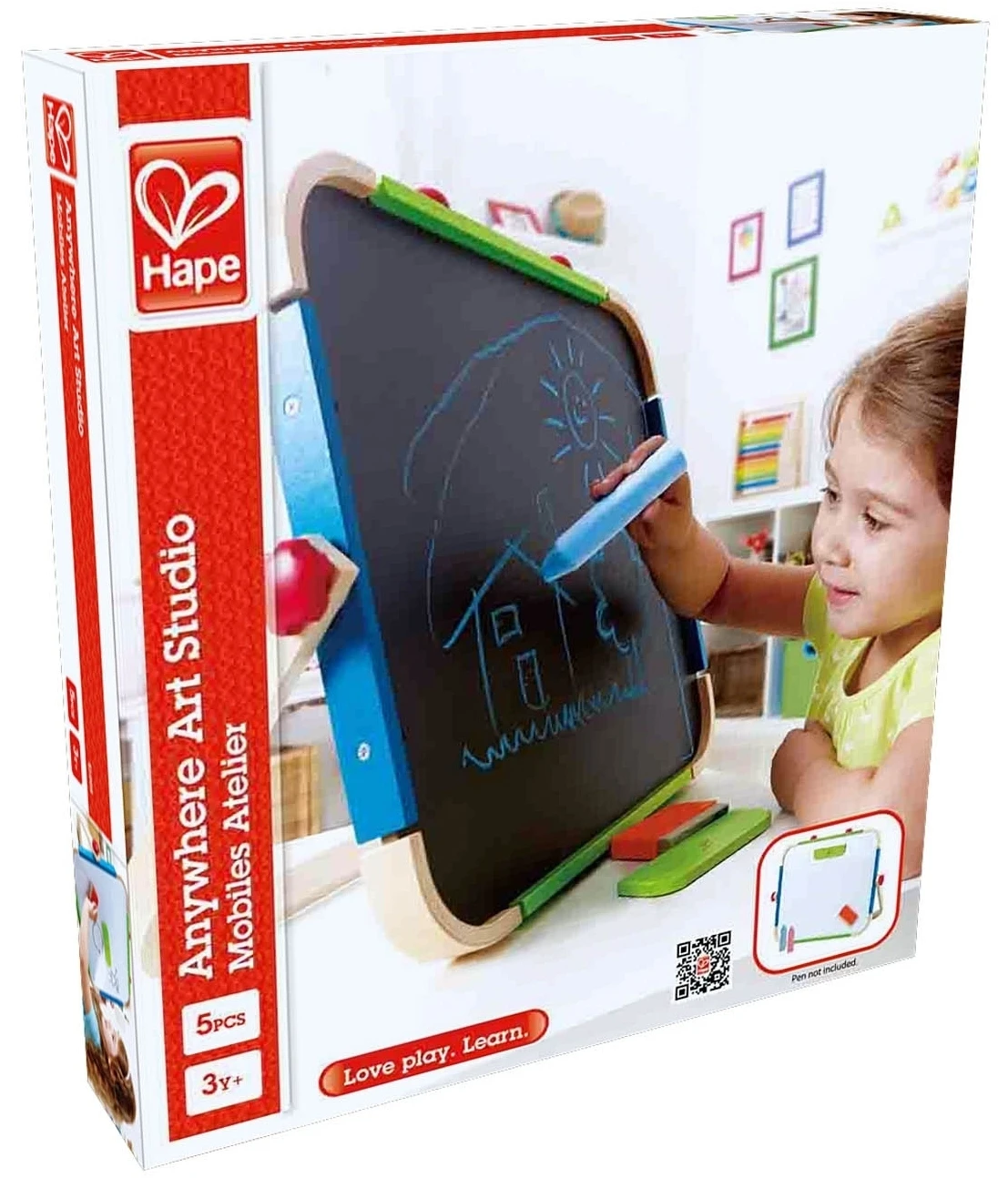 Hape Ξύλινο Φορητό καλλιτεχνικό studio. Αυτό το επιτραπέζιο στούντιο ζωγραφικής κρατάει τους καλλιτέχνες απασχολημένους με ένα μαγνητικό μαυροπίνακα, και έναν μαυροπίνακα για κιμωλίες. Περιλαμβάνει: 1 καβαλέτο, 2 κιμωλίες, 1 σφουγγάρι. Διαστάσεις: 45,70 x 48,5 cm