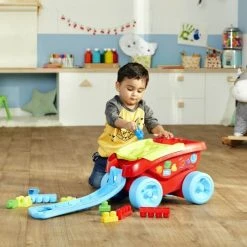 Παιχνίδι κατασκευών για παιδιά προσχολικής ηλικίας! Σχήματα και εξερευνήσεις! Τα παιδιά μαθαίνουν να αναγνωρίζουν σχήματα, καθώς παίζουν με το χρωματιστό βαγόνι. Ταιριάξτε τα ειδικά τουβλάκια πάνω στην επιφάνεια σχημάτων και ρίξτε τα μέσα στον κάδο του βαγονιού! Σύρετε το βαγόνι με το χερούλι μεταφέροντας τα τουβλάκια. Μπορείτε να κατασκευάσετε και κατευθείαν επάνω στο βαγόνι! Το παιδί στοιβάζει, ταιριάζει και παίζει με το βαγόνι, μαθαίνοντας τα σχήματα!