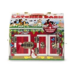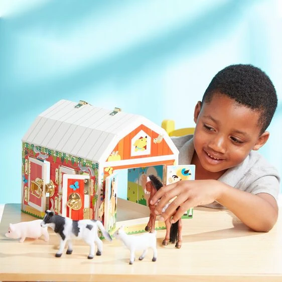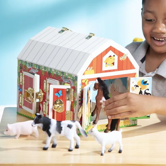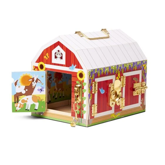 Αποσυνδέστε τα μάνδαλα για να ανοίξετε τις πόρτες του αχυρώνα και να δείτε ποιος είναι μέσα, στη συνέχεια κλείστε τις πόρτες και κουμπώστε ξανά τον αχυρώνα! Αυτός ο όμορφα κατασκευασμένος στιβαρός ξύλινος αχυρώνας είναι ζωγραφισμένος τόσο εσωτερικά όσο και εξωτερικά. Διαθέτει έξι ορειχάλκινες πόρτες με μάνδαλα και κλειδαριές που λειτουργούν, καθώς και εικόνες ζώων φάρμας στο εσωτερικό κάθε πόρτας. Υπάρχει ακόμη και μια ορειχάλκινη λαβή στην κορυφή για να διασκεδάζετε όπου κι αν πάνε τα παιδιά! Το σετ συνοδεύεται από τέσσερις φιγούρες παιχνιδιών ύψους περίπου τριών ιντσών – μια αγελάδα, ένα γουρούνι, μια κατσίκα και ένα άλογο – που χωρούν στον αχυρώνα. Ιδανικό για λεπτή κινητική ανάπτυξη, καθώς και για αναγνώριση χρώματος και ζώων. ενθαρρύνει το δημιουργικό παιχνίδι.