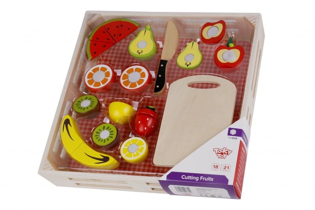 Με έντονα χρώματα και όμορφα σχέδια, το ξύλινο σετ φρούτων κοπής βοηθάει το παιδί να εξοικειωθεί με τα φρούτα , τα σχήματα και τα χρώματα και να αναπτύξει καλύτερο συντονισμό κινήσεων. Συμπεριλαμβάνεται και ξύλο κοπής και δίσκος για την τοποθέτηση των φρούτων.