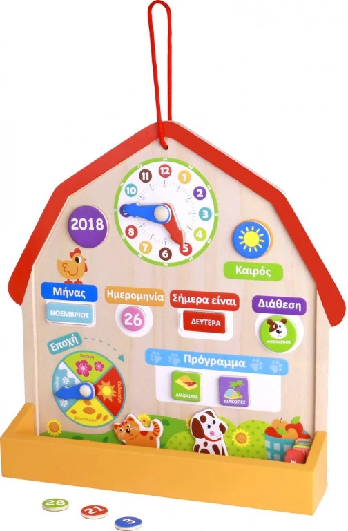 Με αυτό το ξύλινο ημερολόγιο το παιδί μαθαίνει τις ημέρες της εβδομάδας, τους μήνες, τις εποχές και τους αριθμούς. Πρόκειται για ένα ποιοτικό παιχνίδι το οποίο προορίζεται για παιδιά νηπιακής ηλικίας και που στοχεύει στην αριθμητική και αναγνωστική ανάπτυξη.