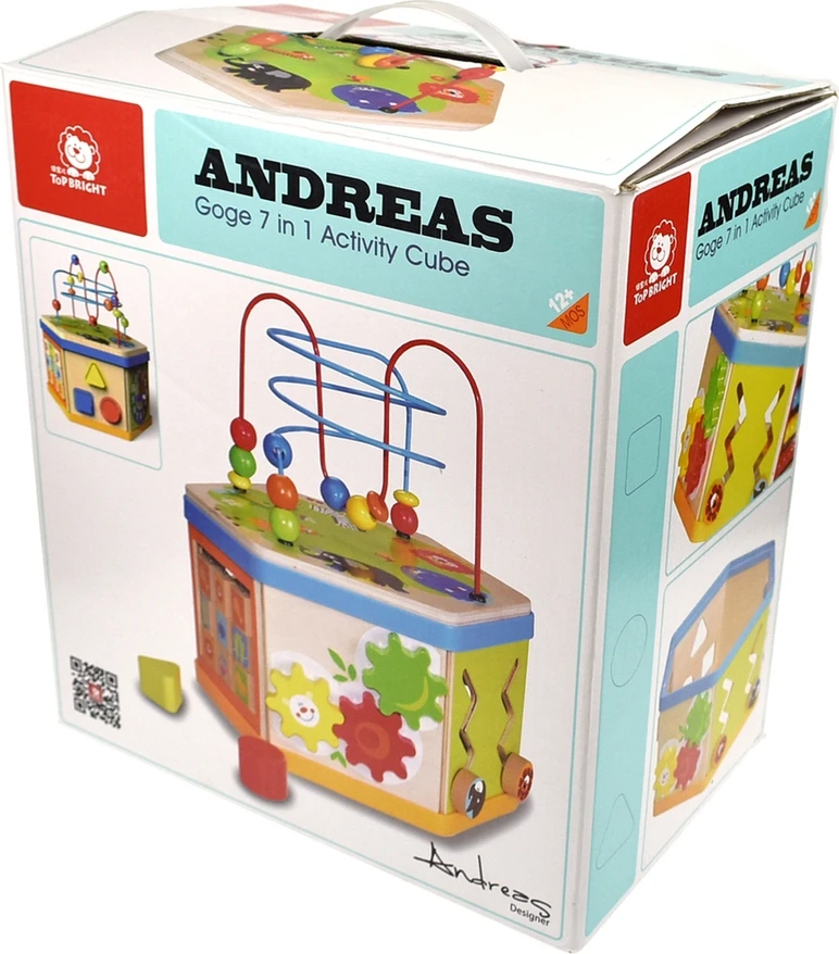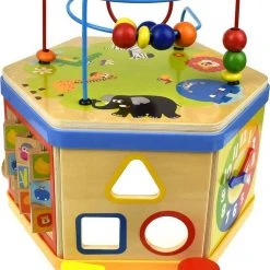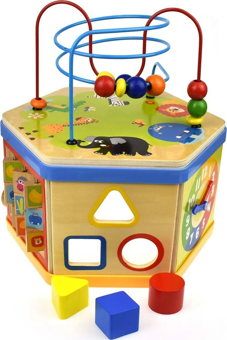Ένα κλασσικό ξύλινο εκπαιδευτικό παιχνίδι με 7 πλευρές διασκέδασης. Με ζωηρά χρώματα και πολύ λειτουργικό σχεδιασμό, χωρίς να θέλει συναρμολόγηση και χωρίς επικίνδυνα μικρά κομμάτια. Αφήστε το παιδί να παίξει με ποικίλους τρόπους για να ασκήσει καλύτερα τις διάφορες ικανότητες του. Ο ξύλινος κύβος δραστηριοτήτων 7 σε 1 έχει αποσπώμενη βάση με λαβύρινθο και χρωματιστές χάντρες στο επάνω μέρος, ενώ η κάθε πλευρά έχει διαφορετική δραστηριότητα, χάντρες μέτρησης χρωματιστές άβακα, γρανάζια, ρολόι, αντιστοίχιση σχημάτων, πίνακας flip με ζώα και προγραφή. Πρόκειται για ένα τέλειο εκπαιδευτικό παιχνίδι που ενθαρρύνει τα αγόρια και κορίτσια ηλικίας 1 έτους και άνω να αναγνωρίζουν σχήματα, χρώματα και να αναπτύσσουν εκλεπτυσμένες κινήσεις, συντονισμό χεριού-ματιού και δεξιότητες επίλυσης προβλημάτων. Κατασκευασμένο με τις πιο αυστηρές προδιαγραφές.