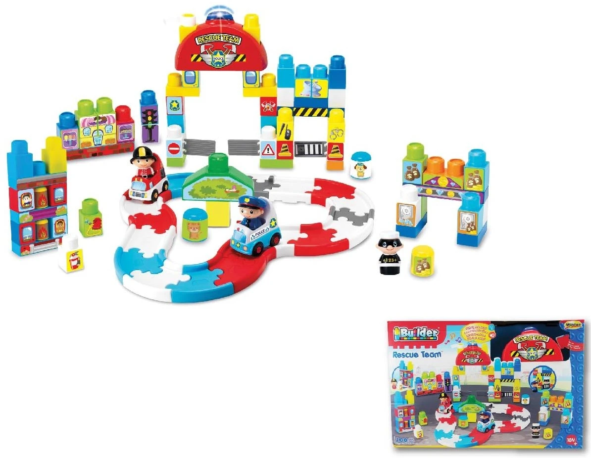 H ομάδα διάσωσης που περιλαμβάνει 100 τμχ. σε διάφορα σχέδια και χρώματα. Με αυτοκόλλητα που κολλώντας τα στα τουβλάκια, μπορεί το παιδί να δημιουργήσει διάφορες παραλλαγές στο αρχικό σχέδιο. Με φως, ήχους και ευχάριστες μελωδίες.