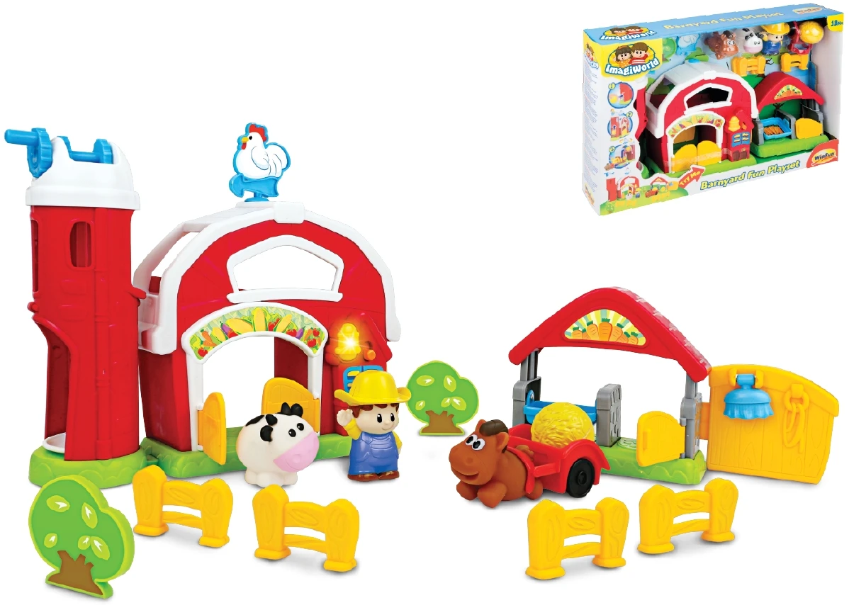 Περιλαμβάνει φάρμα, αγρότη, αγελάδα, άλογο και κάρο, και δεμάτι με άχυρα. Αναβατόριο για τα άχυρα – πίεσε το μοχλό για να σηκώσεις τα άχυρα, ανεμοδείκτης σε σχήμα πετεινού – γύρισέ τον για να ρίξεις τα άχυρα με ηχητικά εφέ. Πόρτες που ανοιγοκλείνουν, κινητές περιφράξεις και δέντρα. Στάβλος: καλάθι με καρότα και χτένα για το άλογο. Κουμπί με φως και χαρούμενους ήχους και μελωδίες.