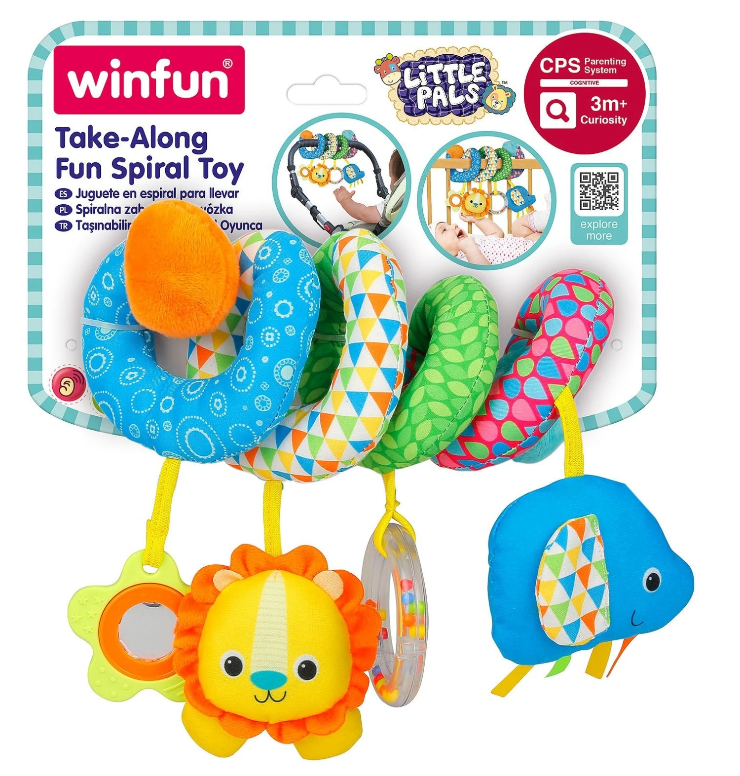 Πολύχρωμο σπιραλ με κουδουνίστρες Take Along Fun Spiral Toy. Με σχήμα σπιράλ για να τυλίγεται εύκολα στην κούνια, στο καροτσάκι ή στο καθισματάκι αυτοκινήτου. Ασφαλές καθρεφτάκι για το παιδί, μαλακό ύφασμα και δαχτυλίδι – κουδουνίστρα.