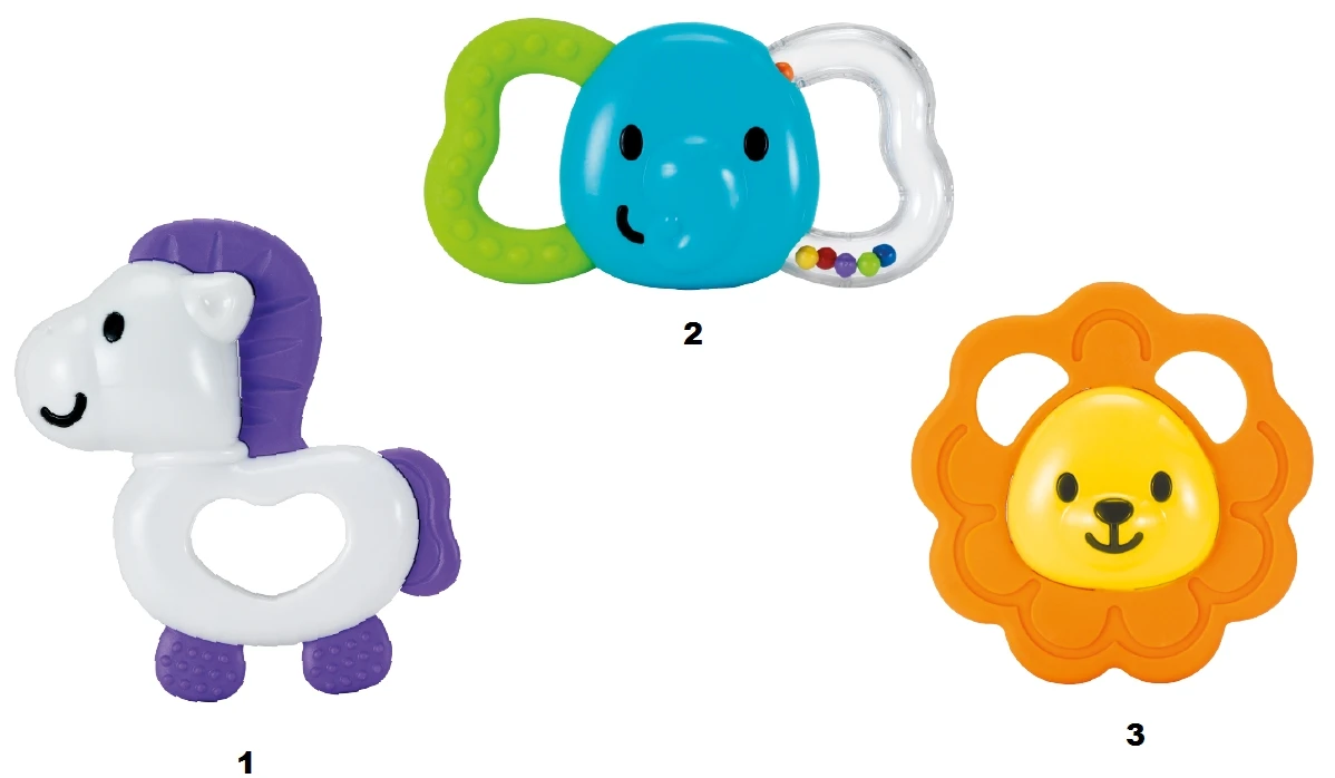 Καταπραϋντικό μασητικό, εύκολο στο κράτημα. Ανάγλυφη υφή ανακουφίζει τα ούλα του μωρού. Πολύχρωμα ζωάκια σε 3 σχέδια. Εύκολο κράτημα για μικρά χεράκια.
